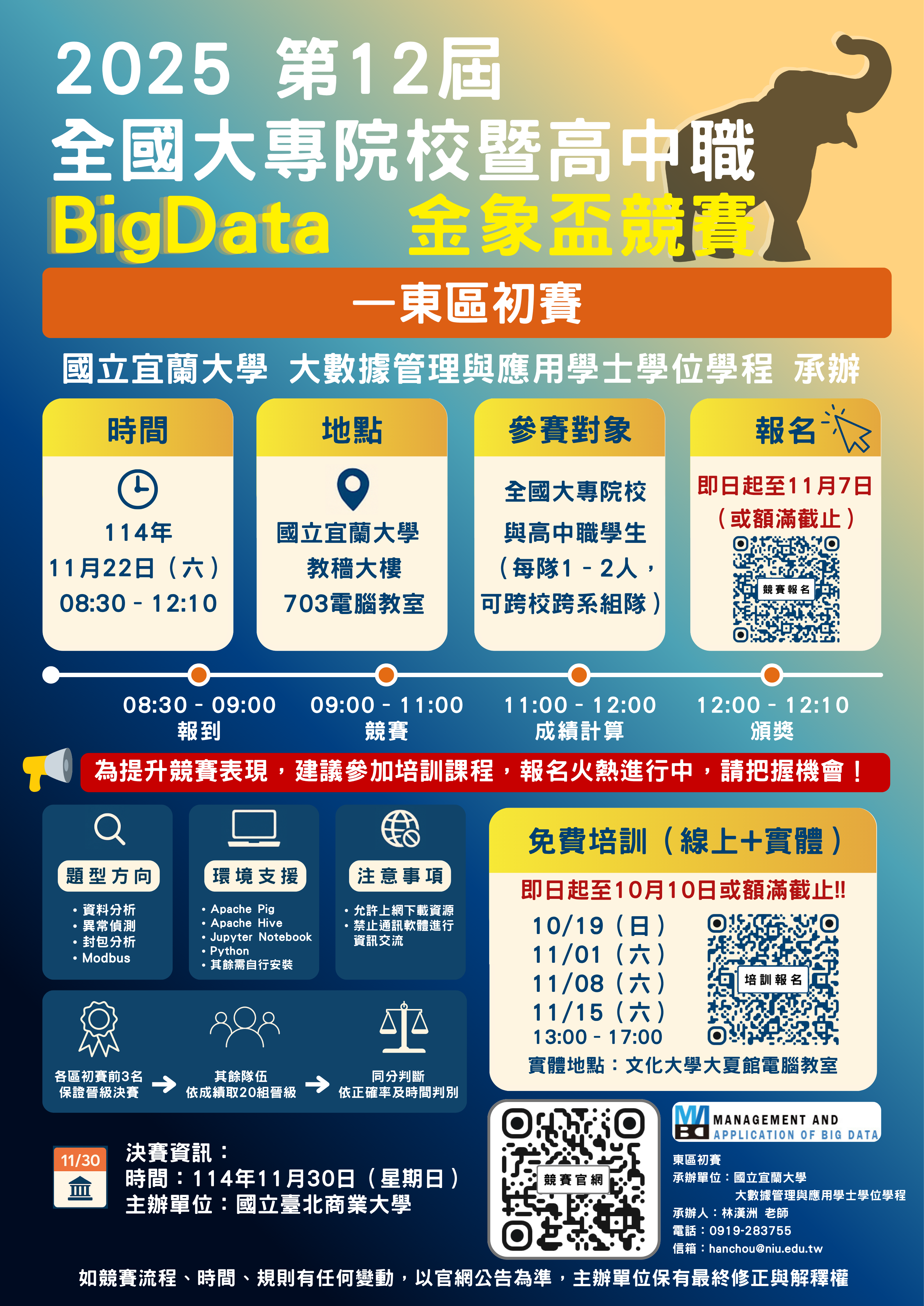 【競賽公告】宜大承辦|2025第12屆 BigData 金象盃東區初賽 即日起報名!